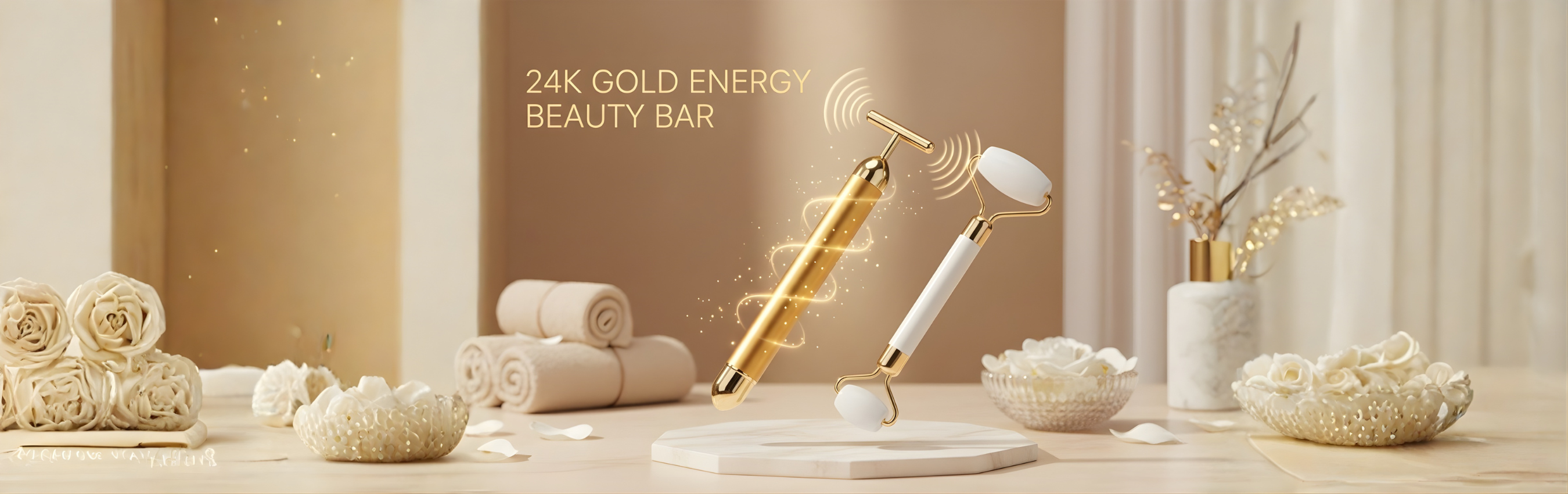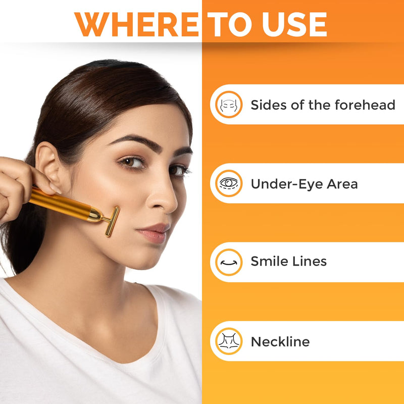The 24K Gold Energy Beauty Bar combines advanced vibration technology with 24-karat gold plating to stimulate collagen production, improve skin elasticity, reduce fine lines, and enhance overall skin radiance. Regular use promotes firmer, more youthful-looking skin with a natural glow.
